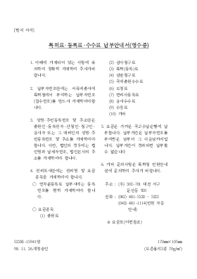 [별지 서식] [별지 서식] 특허료 ○;등록료 ○;수수료 납부안내서(영수증) ○. 아래에 기재되어 있는 사항에 유의하여 정확히 기재하여 주시기바랍니다. ○. 납부자번호란에는 서류제출시에 특허청에서 부여하는 납부자번호 (접수번호)를 반드시 기재하여야합니다. ○. 성명 ○;주민등록번호 및 주소란은 출원인 ○;등록권자 ○;신청인 ○;청구인 ○;응시자 또는 그 대리인의 성명 ○;주민등록번호 및 주소를 기재하여야 합니다. 다만, 법인의 경우에는 법인명과 납세자번호, 법인본사의 주소를 기재하여야 합니다. ○. 권리표시란에는 권리명 및 요금 종목을 기재하여야 합니다. ○ 연차분등록료 납부시에는 등록 번호를 필히 기재하여야 합니 다. ○ 요금종목 (○) 출원료 (○) 심사청구료 (○) 특허(등록)료 (○) 심판청구료 (○) 국제출원수수료 (○) 보정료 (○) 변리사등록료 (○) 응시수수료 (○) 수강료 (○) 기타 ○. 요금은 가까운 국고수납은행에 납부합니다. 납부기간은 납부자번호를 부여받은 날부