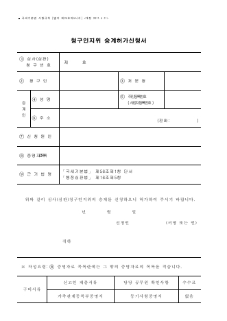 ■ 국세기본법 시행규칙 [별지 제○호의○서식] <개정 ○.○.○> 청구인지위 승계허가신청서 ① 심 사(심 판) 청 구 번 호 제 호 ② 청 구 인 ③ 처 분 청 승 계 인 ④ 성 명 ⑤ 주 민 등 록 번 호 (사 업 자 등 록 번 호) ⑥ 주 소 (전화: ) ⑦ 신 청 원 인 ⑧ 증명자 료 목 록 ⑨ 근 거 법 령 「국세기본법」 제○조제○항 단서 「행정심판법」 제○조제○항 위와 같이 심사(심판)청구인지위의 승계를 신청하오니 허가하여 주시기 바랍니다. 년 월 일 신청인 (서명 또는 인) 귀하 ※ 작성요령: ⑧ 증명자료 목록란에는 그 밖의 증명자료의 목록을 적습니다. 구비서류 신고인 제출서류 담당 공무원 확인사항 수수료 가족관계등록부증명서 등기사항증명서 없음 ○㎜×○㎜[일반용지 ○g/㎡(재활용품)]