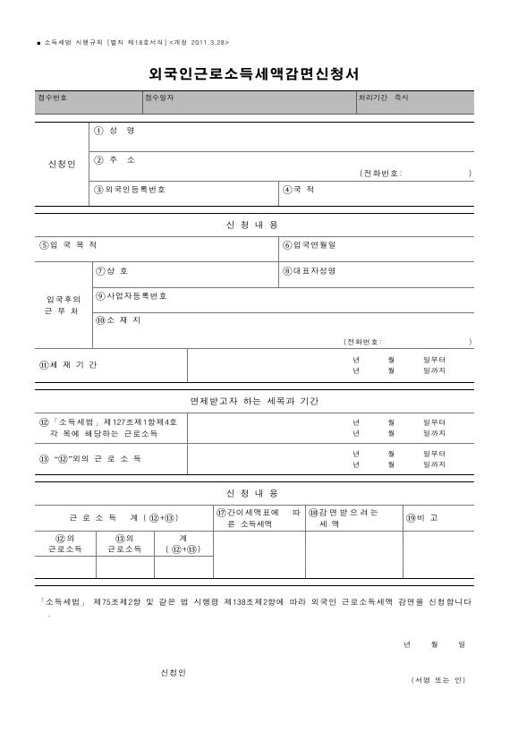 ■ 소득세법 시행규칙 [별지 제○호서식] <개정 ○.○.○> 외국인근로소득세액감면신청서 접수번호 접수일자 처리기간 즉시 신청인 ① 성 명 ② 주 소 (전화번호: ) ③외국인등록번호 ④국적 신청내용 ⑤입국목적 ⑥입국연월일 입국후의 근무처 ⑦상호 ⑧대표자성명 ⑨사업자등록번호 ⑩소재지 (전화번호: ) ⑪체재기간 년 월 일부터 년 월 일까지 면제받고자 하는 세목과 기간 ⑫「소득세법」제○조제○항제○호 각 목에 해당하는 근로소득 년 월 일부터 년 월 일까지 ⑬ “⑫”외의 근로소득 년 월 일부터 년 월 일까지 신청내용 근로소득 계(⑫+⑬) ○;간이세액표에 따른 소득세액 ○;감면받으려는 세액 ○;비고 ⑫의 근로소득 ⑬의 근로소득 계 (⑫+⑬) 「소득세법」 제○조제○항 및 같은 법 시행령 제○조제○항에 따라 외국인 근로소득세액 감면을 신청합니다. 년 월 일 신청인 (서명 또는 인) 세 무 서 장 귀하 ○mm×○mm[일반용지 ○g/㎡(재활용품)]