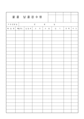 물품.납품검수원 물 품 ○; 납 품 검 수 원 작 성 년 월 일 년 월 일 제 품 명 제품코드 납 품 처 규 격 수 량 단 가 금 액 비 고