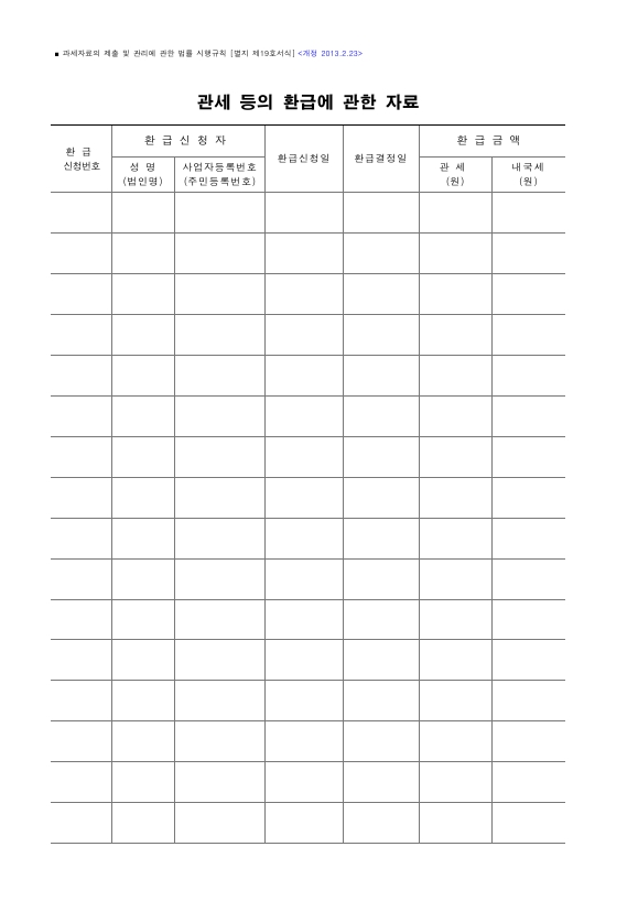 관세 등의 환급에 관한 자료 [과세자료의 제출 및 관리에 관한 법률 시행규칙 서식19] 서식 무료 다운로드