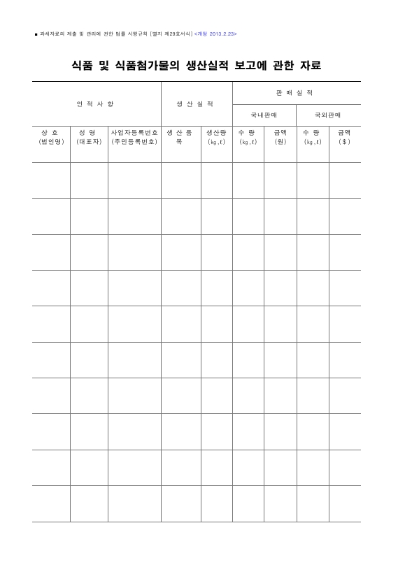 법령안(일부개정 법률) ■ 과세자료의 제출 및 관리에 관한 법률 시행규칙 [별지 제○호서식] <개정 ○.○.○> 식품 및 식품첨가물의 생산실적 보고에 관한 자료 인적사항 생산실적 판매실적 국내판매 국외판매 상호 (법인명) 성명 (대표자) 사업자등록번호 (주민등록번호) 생산품목 생산량 (㎏,ℓ) 수량 (㎏,ℓ) 금액 (원) 수량 (㎏,ℓ) 금액 ($) ○mm×○mm[백상지 ○g/㎡]