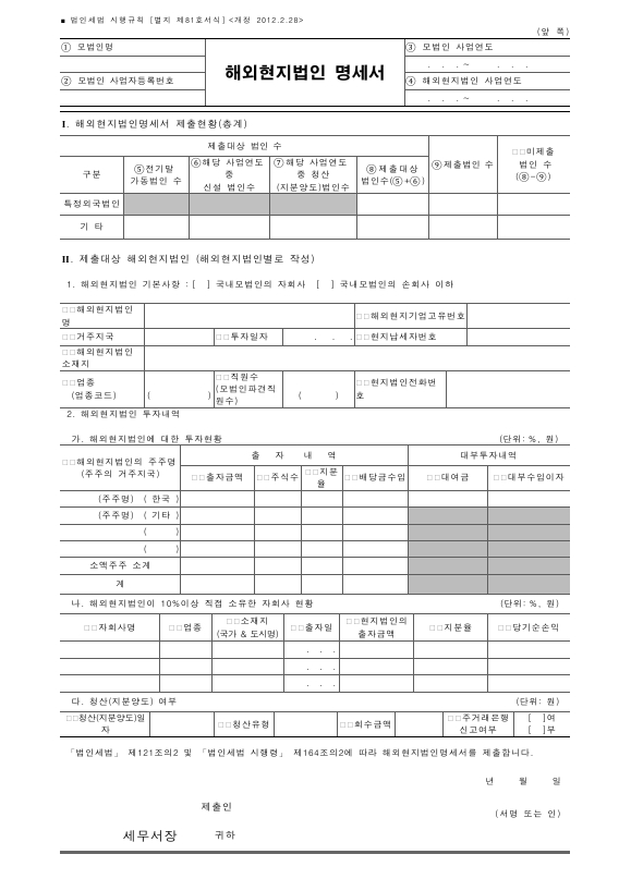 해외현지법인 명세서 [법인세법 시행규칙 서식81] 서식 무료 다운로드