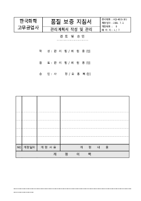 지침서 관리계획서작성및관리 한국화학 고무공업사 품질 보증 지침서 문서번호 : HQI ○ ○ 제정일자 : ○. ○. ○. 개정번호 : ○ 페 이 지 : ○ / ○ 관리계획서 작성 및 관리 검 토 및 승 인 ○; ○; ○; ○; ○; ○; ○; ○; ○; ○; ○; ○; ○; ○; ○; ○; ○; ○; ○; ○; ○; ○; ○; 작 성 : 관 리 팀 / 최 원 용 (인) 검 토 : 관 리 팀 / 최 원 용 (인) 승 인 : 사 장 / 오 흥 복 (인) NO 개정일자 개 정 사 유 개 정 내 용 개 정 이 력 한국화학 고무공업사 품질 보증 지침서 문서번호 : HQI ○ ○ 제정일자 : ○. ○. ○. 개정번호 : ○ 페 이 지 : ○ / ○ 관리계획서 작성 및 관리 ○. 목적 및 적용 범위 본 지침서는 PROTO 양산초도품 양산품에 대하여 제품 및 공정을 관리하기 위한 관리계획서의 작성 및 관리업무를 규정함으로서 제품품질을 확보하는데 그 목적이