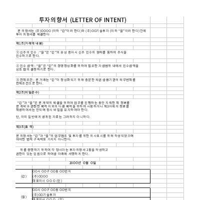 투자의향서 (LETTER OF INTENT) " 본 의향서는 (주)OOOO (이하 “갑”이라 한다)와 (주)OO기술투자 (이하 “을”이라 한다)간에 투자 의향서를 체결한다 " 제○조(거래의 내용) "① 신주의 인수 : “을”은 “갑”의 유상 증자시 신주 인수의 형태를 통하여 주식을 인수하기로 한다. " "② 인수 금액 : “을”은 “갑”의 경영정상화를 위하여 필요한 자금범위 내에서 인수금액을 상호 협의 결정하기로 한다. " "③ 전제조건 : 본 거래는 “갑”이 정상화되기 위해 충분한 채권 금융기관의 채무변제를 전제조건으로 한다. " 제○조(비밀준수) " “갑”과 “을”은 본 계약의 체결을 위하여 업무를 진행하는 동안 지득한 제 정보를 본 계약과 관련한 목적 이외의 다른 목적을 위하여 사용하거나 제○자에게 정보를 제공하여서는 안되며 항시 비밀을 유지하여야 한다. 단 이미 일반에게 공개된 자료는 그러하지 아니하다. " 제○조(효 력) "본 의향서는 “갑”과 “을”의 업무협조 및 투자를