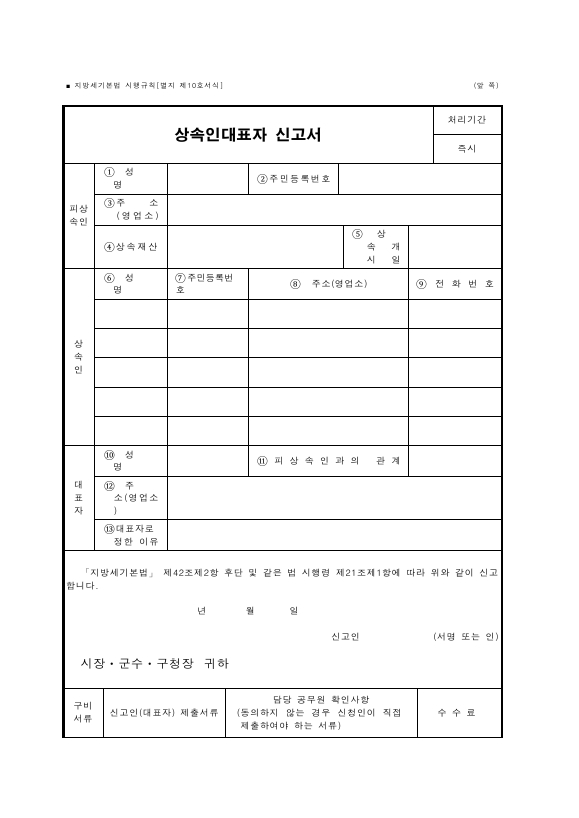 상속인대표자 신고서 [지방세기본법 시행규칙 서식10] 서식 무료 다운로드