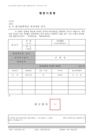 ■ 국세징수법 시행규칙 [별지 제○호의○서식] <신설 ○.○.○> 행 정 기 관 명 수신자 (경유) 제 목 참가압류재산 매각처분 최고 귀 서에서 압류한 재산에 대하여 조속히 매각처분을 진행하여 주시기 바랍니다. 매각처분 최고일 이후 ○개월이 경과하여도 매각 절차가 진행되지 않을 경우 우리 서에서 매각할 것을 알립니다(근거: 「국세징수법」 제○조제○항). 체납자 성 명 (상 호) 생년월일 (사업자등록번호) 주 소 (사업장) 압류재산의 표시 매각최고일자 년 월 일 압류일자 참가압류에 관계된 체납액 (단위: 원) 세목코드 발행번호 연도ㆍ기분 내국세 농어촌특별세 세 목 납부기한 계 교육세 가 산 금 끝. 발신명의 직인 이 통지에 대한 문의사항이 있을 때에는 ○과 담당자 ○(전화: )에게 연락하시면 친절하게 상담해 드리겠습니다. 기안자 직위(직급) 서명 검토자 직위(직급)서명 결재권자 직위 (직급)서명 협조자 시행 처리과 일련번호(시행일자) 접수 처리과명 일련번호(접수일자) 우 주