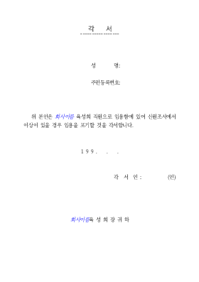 각서 각 서 성 명: 주민등록번호: 위 본인은 회사이름 육성회 직원으로 임용함에 있어 신원조사에서 이상이 있을 경우 임용을 포기할 것을 각서합니다. ○ ○ ○ . . . 각 서 인 : (인) 회사이름육 성 회 장 귀 하