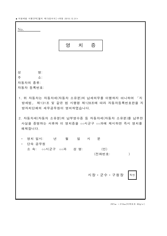 법령안(일부개정 법률) ■ 지방세법 시행규칙[별지 제○호서식] <개정 ○.○.○> No. 영 치 증 성 명: 주 소: 자동차의 종류: 자동차 등록번호: ○. 위 자동차는 자동차세(자동차 소유분)의 납세의무를 이행하지 아니하여 「지방세법」 제○조 및 같은 법 시행령 제○조에 따라 자동차등록번호판을 지방자치단체의 세무공무원이 영치하였습니다. ○. 자동차세(자동차 소유분)의 납부영수증 등 자동차세(자동차 소유분)를 납부한 사실을 증명하는 서류와 이 영치증을 ○시군구 ○과에 제시하면 즉시 영치를 해제합니다. ㆍ 영치 일시: 년 월 일 시 분 ㆍ 단속 공무원 소 속: ○시군구 ○과 성 명: (인) (전화번호: ) 시장ㆍ군수ㆍ구청장 직인 ○㎜ × ○㎜(미색모조 ○g/㎡)