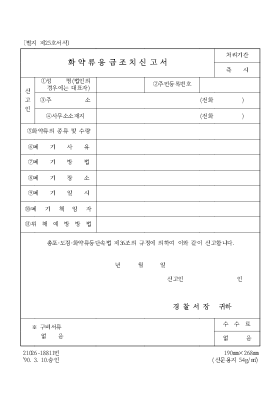 〔별지 제○호서식〕 〔별지 제○호서식〕 화약류응급조치신고서 처리기간 즉 시 신 고 인 ①성 명(법인의 경우에는 대표자) ②주민등록번호 ③주 소 (전화 ) ④사무소소재지 (전화 ) ⑤화약류의 종류 및 수량 ⑥폐 기 사 유 ⑦폐 기 방 법 ⑧폐 기 장 소 ⑨폐 기 일 시 ⑩폐 기 책 임 자 ⑪위 해 예 방 방 법 총포·도검·화약류등단속법 제○조의 규정에 의하여 이와 같이 신고합니다. 년 월 일 신고인 ○; ○; 경 찰 서 장 귀하 ※ 구비서류 없 음 수 수 료 없 음 ○ ○민 ○㎜×○㎜ ’○. ○. ○.승인 (신문용지 ○g/㎡)