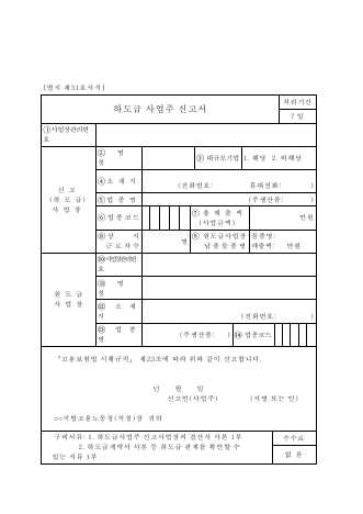 [별지 제○호서식] 하도급 사업주 신고서 처리기간 ○일 ①사업장관리번호 신고 (하도급) 사업장 ②명 칭 ③ 대규모기업 ○. 해당 ○. 비해당 ④소재지 (전화번호: 휴대전화: ) ⑤업종명 (주생산품: ) ⑥업종코드 ⑦ 총매출액 (사업금액) 만원 ⑧상 시 근로자수 명 ⑨ 원도급사업장 납품물품명 물품명: 매출액: 만원 원도급 사업장 ⑩사업장관리번호 ⑪ 명 칭 ⑫ 소재지 (전화번호: ) ⑬ 업종명 (주생산품: ) ⑭ 업종코드 「고용보험법 시행규칙」 제○조에 따라 위와 같이 신고합니다. 년 월 일 신고인(사업주) (서명 또는 인) ○지방고용노동청(지청)장 귀하 구비서류: ○. 하도급사업주 신고사업장의 결산서 사본 ○부 ○. 하도급계약서 사본 등 하도급 관계를 확인할 수 있는 서류 ○부 수수료 없음 ※ 공지사항 : 본 민원의 처리결과에 대한 만족도 조사 및 관련 제도 개선에 필요한 의견조사를 위해 귀하의 전화번호(휴대전화)로 전화조사를 실시할 수 있습니다. ○mm×○mm[일반용지 ○g/㎡(재활
