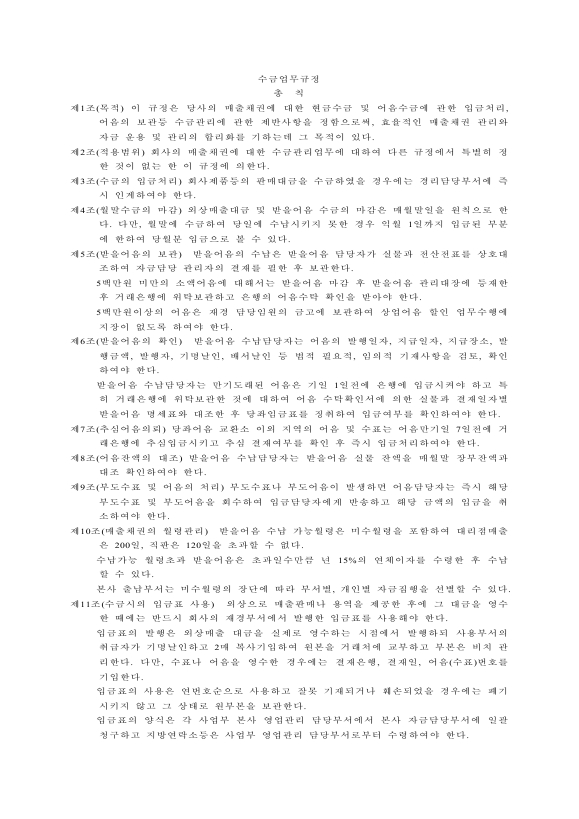 수금업무규정 총 칙 제○조(목적) 이 규정은 당사의 매출채권에 대한 현금수금 및 어음수금에 관한 입금처리 어음의 보관등 수금관리에 관한 제반사항을 정함으로써 효율적인 매출채권 관리와 자금 운용 및 관리의 합리화를 기하는데 그 목적이 있다. 제○조(적용범위) 회사의 매출채권에 대한 수금관리업무에 대하여 다른 규정에서 특별히 정한 것이 없는 한 이 규정에 의한다. 제○조(수금의 입금처리) 회사제품등의 판매대금을 수금하였을 경우에는 경리담당부서에 즉시 인계하여야 한다. 제○조(월말수금의 마감) 외상매출대금 및 받을어음 수금의 마감은 매월말일을 원칙으로 한다. 다만 월말에 수금하여 당일에 수납시키지 못한 경우 익월 ○일까지 입금된 부분에 한하여 당월분 입금으로 볼 수 있다. 제○조(받을어음의 보관) 받을어음의 수납은 받을어음 담당자가 실물과 전산전표를 상호대조하여 자금담당 관리자의 결재를 필한 후 보관한다. ○백만원 미만의 소액어음에 대해서는 받을어음 마감 후 받을어음 관리대장에 등재한 후