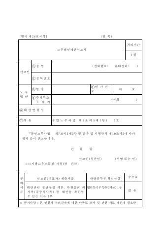 파견근로자보호등에관한법률중개정법률안 [별지 제○호서식] (앞쪽) 노무법인해산신고서 처리기간 ○ 일 신고인 ①성명 (전화번호: 휴대전화: ) ②등록번호 노무 법인 ③명칭 ④인가번호 제 호 ⑤주사무소 소재지 (전화: ) ⑥해산연월일 ⑦사유 공인노무사법 제○조의○제○항( )호 「공인노무사법」 제○조의○제○항 및 같은 법 시행규칙 제○조의○에 따라 위와 같이 신고합니다. 년 월 일 신고인(청산인) (서명 또는 인) ○지방고용노동청(지청)장 귀하 구비서류 신고인(대표자) 제출서류 담당공무원 확인사항 수수료 해산관련 정관규정 사본, 사원총회 의사록(공증의사록) 등 해산을 확인할 수 있는 서류 ○부 법인등기부 등본(해산) ○부 없음 ※ 공지사항 : 본 민원의 처리결과에 대한 만족도 조사 및 관련 제도 개선에 필요한 의견조사를 위해 귀하의 전화번호(휴대전화)로 전화조사를 실시할 수 있습니다. ○mm×○mm(일반용지 ○g/㎡(재활용품)) ※ 이 신고서는 아래와 같이 처리됩니다. (뒤쪽) 신고인 처리