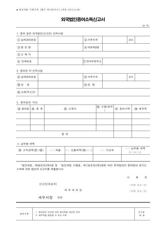 외국법인증여소득신고서 [법인세법 시행규칙 서식72] 서식 무료 다운로드