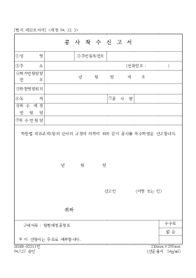 [별지 제○호서식] <개정 ○.○.○> [별지 제○호서식] <개정 ○. ○. ○> 공 사 착 수 신 고 서 ①성 명 ②주민등록번호 ③주 소 (전화번호 : ) ④허가연월일및 번 호 년 월 일 제 호 ⑤하천명및위치 ⑥목 적 ⑦공 사 량 ⑧착 수 예 정 연 월 일 ⑨착 수 연 월 일 하천법 제○조제○항의 단서의 규정에 의하여 위와 같이 공사를 착수하였음 신고합니다. 년 월 일 신고인 (서명 또는 인) 귀하 구비서류 : 월별예정공정표 ※ 이 신청서는 무료로 배부합니다. 수수료 없 음 ○ ○민 ○mm×○mm ○.○.○ 승인 (신문용지 ○g/㎡)