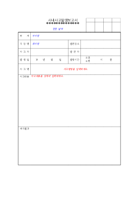 사내사고발생보고서 사내사고발생보고서 만든 날짜 부 서 부서명 직 장 명 회사명 발견장소 사 고 자 발 견 자 발 생 일 ○ 년 월 일 발생시간 오전 오후 시 분 사 고 명 사고명칭을 입력하세요. 사고내용 사고내용을 상세히 입력하세요. 처리결과