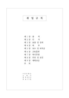 취 업 규 칙 제 ○ 장 총 칙 제 ○ 장 인 사 제 ○ 장 표창 및 징계 제 ○ 장 복 무 제 ○ 장 보수 및 퇴직금 제 ○ 장 교육훈련 제 ○ 장 복리후생 제 ○ 장 안전 및 보건 제 ○ 장 재해보상 부 칙 사 업 장 명 칭 : 소 재 지 : 전 화 번 호 : 대 표 자 명 : 제 ○ 장 총 칙 제○조(목적) 이 규정은 근로기준법에 의거 당사 사원의 취업에 관한 기본사항을 정함을 목적으로 한다. 제○조(적용범위) 사원의 취업조건에 관하여는 다른 규정에서 특별히 정한 것을 제외하고는 이 규 정에 따른다. 제○조(사원의 정의) 이 규정에서 "사원"이라 함은 당사에 상시 근무하는 자로서 인사관리규정에서 정한 사원을 말한다. 제○조(규정준수) 회사와 사원은 이 규정을 성실히 준수할 의무를 진다. 제○조(준용) 이 규정에서 정하지 않은 세부사항 등은 근로기준법 및 단체협약 또는 회사의 다른 규정이 정하는 바에 따른다. 제 ○ 장 인 사 제○절 채 용 제○조(채용) ① 회