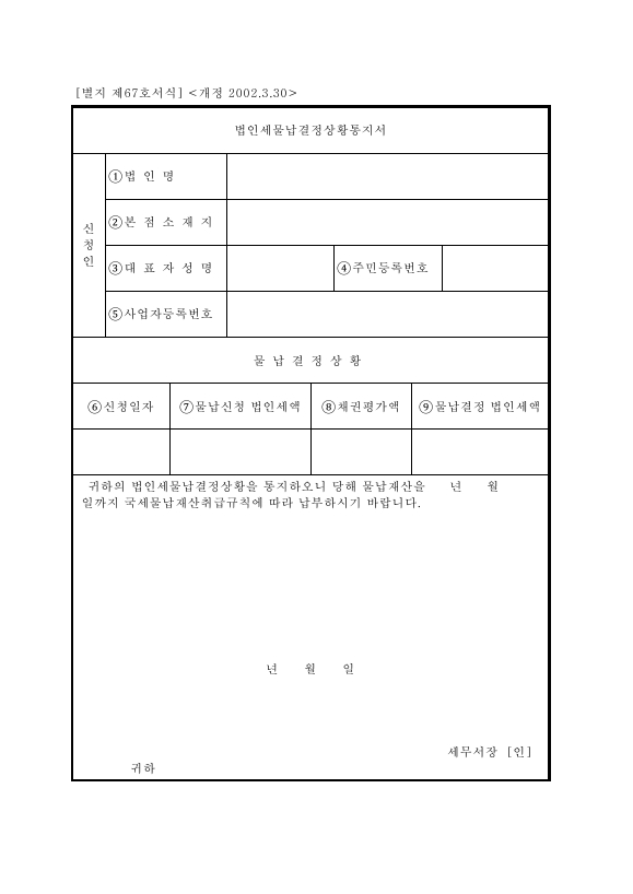 법인세물납결정상황통지서 [법인세법 시행규칙 서식67] 문서는 한글(HWP), 워드(DOC) 형식으로 제공되어, 바로 다운로드하여 편리하게 사용할 수 있습니다. 필요한 서식을 빠르게 찾고 이용해보세요.