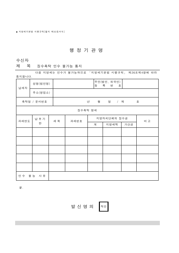 징수촉탁 인수 불가능 통지 [지방세기본법 시행규칙 서식32] 서식 무료 다운로드