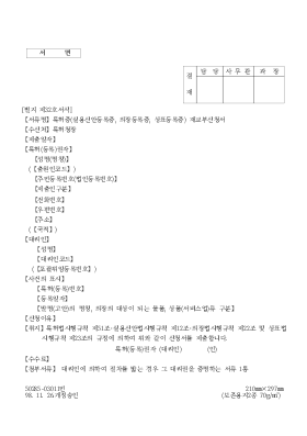 [별지 제○호서식] 서 면 결 재 담 당 사 무 관 과 장 [별지 제○호서식] 【서류명】특허증(실용신안등록증, 의장등록증, 상표등록증) 재교부신청서 【수신처】특허청장 【제출일자】 【특허(등록)권자】 【성명(명칭)】 (【출원인코드】) 【주민등록번호(법인등록번호)】 【제출인구분】 【전화번호】 【우편번호】 【주소】 (【국적】) 【대리인】 【성명】 【대리인코드】 (【포괄위임등록번호】) 【사건의 표시】 【특허(등록)번호】 【등록일자】 【발명(고안)의 명칭, 의장의 대상이 되는 물품, 상품(서비스업)류 구분】 【신청이유】 【취지】특허법시행규칙 제○조 ○;실용신안법시행규칙 제○조 ○;의장법시행규칙 제○조 및 상표법시행규칙 제○조의 규정에 의하여 위와 같이 신청서를 제출합니다. 특허(등록)권자 (대리인) (인) 【수수료】 【첨부서류】 대리인에 의하여 절차를 밟는 경우 그 대리권을 증명하는 서류 ○통 ○ ○민 ○㎜×○㎜ ○. ○. ○.개정승인 (보존용지○종 ○g/㎡) ※ 기재요령 ○.【서류명】란에는