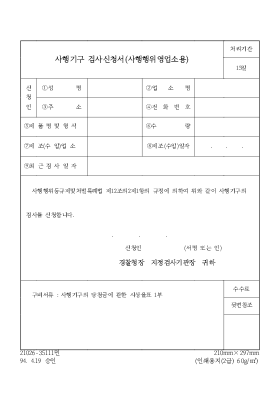 ○ ○민 사행기구 검사신청서(사행행위영업소용) 처리기간 ○일 신 청 인 ①성 명 ②업 소 명 ③주 소 ④전 화 번 호 ⑤제 품 명 및 형 식 ⑥수 량 ⑦제 조(수 입)업 소 ⑧제조(수입)일자 . . . ⑨최 근 검 사 일 자 사행행위등규제및처벌특례법 제○조의○제○항의 규정에 의하여 위와 같이 사행기구의 검사를 신청합니다. . . . 신청인 (서명 또는 인) 경찰청장 지정검사기관장 귀하 구비서류 : 사행기구의 당첨금에 관한 시상율표 ○부 수수료 뒷면참조 ○ ○민 ○mm×○mm ○. ○.○ 승인 (인쇄용지(○급) ○g/㎡) 이 신청서는 아래와 같이 처리됩니다. (뒷면) 신 청 자 처 리 기 관 경찰청장이 지정하는 검사기관 신청서 작성 접 수 검 토 결 재 검 사 (신 청) 결 재 검사 합격증 교부 수 수 료 ○; ○; ○; ○; ○; ○; ○; ○; ○; ○; ○; ○; ○; ○; ○; ○; ○; ○; ○; ○; ○; ○; ○; ○; ○;