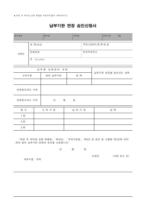 납부기한 연장 승인신청서 [취업 후 학자금 상환 특별법 시행규칙 서식85] 서식 무료 다운로드