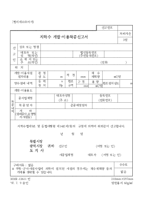 〔별지제○호서식〕 〔별지제○호서식〕 신고번호 지하수 개발·이용착공신고서 처리기간 ○일 신 고 인 상호 또는 명칭 대표자 또는 성 명(개인) 법인등록번호 (주민등록번호) 소 재 지 또는 주 소(개인) (전화: ) 위 치 개발·이용시설 설치내용 관 정 심 도 m 직 경 mm 채 수 계획량 ㎥/일 양수설비 내역 동 력 장 치 ψ v Hp 펌프 규격 구 경 용 량 펌프설치심도 m mm ㎥/일 개발·이용용도 착 공 내 역 공사업체명 대표자성명 (주 소) 등록번호 (전화번호) 착공일자 준공예정일자 기 타 (설비공사,오염방지시설등) 지하수법제○조 및 동법시행령 제○조제○항의 규정에 의하여 위와같이 신고합니다. 년 월 일 특별시장 광역시장 귀하 신고인 (서명 또는 인) 도 지 사 시공업체명 대표자 (서명 또는 인) 구비서류 : 없음 ※ 국방 ○;군사시설사업에 의하여 설치된 시설의 경우에는 채수계획량 등의 기재를 생략할 수 있습니다. 수수료 없음 ○ ○ 민 ○mm×○mm ‘○. ○. ○ 승인 일반용