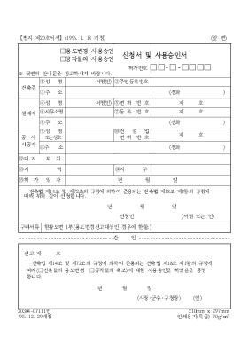 【별지 제○호서식】(○. ○. ○ 개정) 【별지 제○호서식】(○. ○. ○ 개정) (앞 면) □용도변경 사용승인 신청서 및 사용승인서 □공작물의 사용승인 허가번호 □□ □ □□□□ ※ 뒷면의 안내문을 참고하시기 바랍니다. 건축주 ①성 명 서명(인) ②주민등록번호 ③주 소 (전화 ) 설계자 ④성 명 서명(인) ⑤면 허 번 호 제 호 ⑥사무소명 ⑦등 록 번 호 제 호 ⑧주 소 (전화 ) 공 사 시공자 ⑨성 명 또는상호 ⑩건 설 업 면 허 번 호 제 호 ⑪주 소 (전화 ) ⑫대 지 위 치 ⑬지 역 ⑭지 구 ⑮허 가 일 자 년 월 일 건축법 제○조 및 제○조의 규정에 의하여 준용되는 건축법 제○조 제○항의 규정에 따라 위와 같이 신청합니다. 년 월 일 신청인 (서명 또는 인) 구비서류 현황도면 ○부(용도변경신고대상인 경우에 한함.) 간 인 신고 제 호 건축법 제○조 및 제○