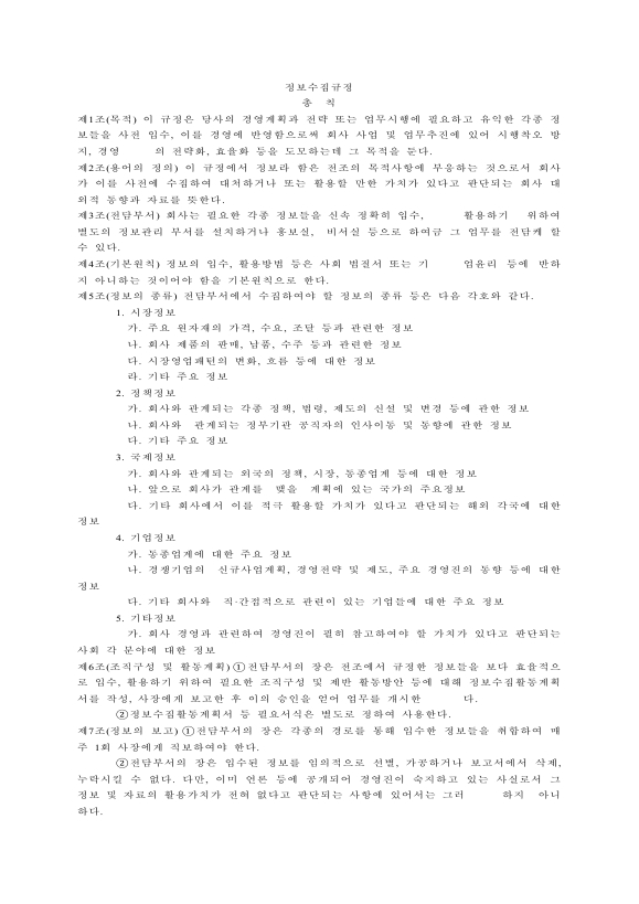 정보수집규정 총 칙 제○조(목적) 이 규정은 당사의 경영계획과 전략 또는 업무시행에 필요하고 유익한 각종 정보들을 사전 입수 이를 경영에 반영함으로써 회사 사업 및 업무추진에 있어 시행착오 방지 경영 의 전략화 효율화 등을 도모하는데 그 목적을 둔다. 제○조(용어의 정의) 이 규정에서 정보라 함은 전조의 목적사항에 부응하는 것으로서 회사가 이를 사전에 수집하여 대처하거나 또는 활용할 만한 가치가 있다고 판단되는 회사 대외적 동향과 자료를 뜻한다. 제○조(전담부서) 회사는 필요한 각종 정보들을 신속 정확히 입수 활용하기 위하여 별도의 정보관리 부서를 설치하거나 홍보실 비서실 등으로 하여금 그 업무를 전담케 할 수 있다. 제○조(기본원칙) 정보의 입수 활용방법 등은 사회 법질서 또는 기 업윤리 등에 반하지 아니하는 것이어야 함을 기본원칙으로 한다. 제○조(정보의 종류) 전담부서에서 수집하여야 할 정보의 종류 등은 다음 각호와 같다. ○. 시장정보 가. 주요 원자재의 가격 수요 조달 등과