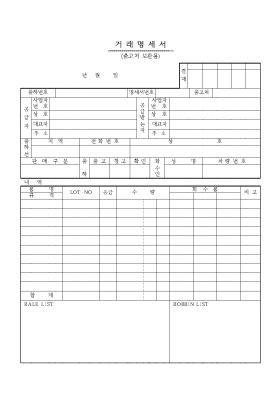거 래 명 세 서 (출고처 보관용) 년 월 일 결재 출하번호 명세서번호 출고처 공 급 자 사업자 번 호 공 급 받 는 자 사업자 번 호 상 호 상 호 대표자 대표자 주 소 주 소 출하선 지 역 전 화 번 호 상 호 판 매 구 분 출 하 출 고 창 고 확 인 화 수 인 성 명 차 량 번 호 내 역 품 명 LOT NO 등급 수 량 회 수 품 비 고 규 격 합 계 BALE LIST BOBBIN LIST