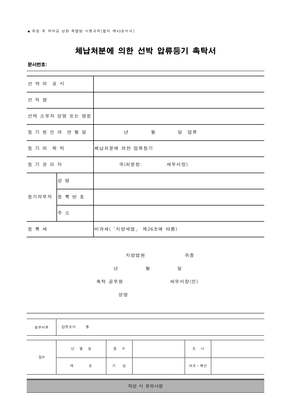 체납처분에 의한 선박 압류등기 촉탁서 [취업 후 학자금 상환 특별법 시행규칙 서식43] 서식 무료 다운로드