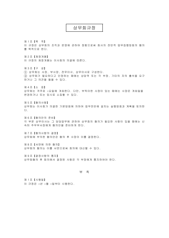 제○조【목 적】 상무회규정 제○조【목 적】 이 규정은 상무회의 조직과 운영에 관하여 정함으로써 회사의 전반적 업무집행방침의 협의를 목적으로 한다. 제○조【제정개폐】 이 규정의 제정개폐는 이사회의 의결에 따른다. 제○조【구 성】 ① 상무회는 사장, 부사장, 전무이사, 상무이사로 구성한다. ② 상무회가 필요하다고 인정하는 때에는 상담역 또는 각 부장, 기타의 자의 출석을 요구하거나 그 의견을 들을 수 있다. 제○조【소 집】 상무회는 격주로 ○요일에 개최한다. 다만, 부득이한 사정이 있는 때에는 사장은 개최일을 변경하거나 또는 임시로 소집할 수 있다. 제○조【협의사항】 상무회는 이사회가 의결한 기본방침에 의하여 업무전반에 걸치는 실행방침과 계획을 토의한다. 제○조【협의안의 준비】 각 부문 상무이사는 그 담당업무에 관하여 상무회의 협의가 필요한 사항이 있을 때에는 신속히 주무부서장에게 협의안을 준비하게 한다. 제○조【협의사항의 결정】 상무회에 부의한 협의안은 협의 후 사장이 이를 결정한다.