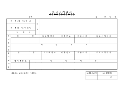 보고서계출서 보 고 서 계 출 서 귀하 ※ 년 월 일 계 출 (개 폐) 번 호 적 요 계 출 (개 폐) 년 월 일 년 월 일 ※ 계 출 사 항 명 칭 보 고 책 임 자 제 출 빈 도 제 출 시 기 보 고 서 청 구 자 작 성 목 적 ※ 개 폐 사 항 명 칭 보 고 책 임 자 제 출 빈 도 제 출 시 기 보 고 서 청 구 자 기 계 출 번 호 개 폐 이 유 계출자는 ※표사항에만 기재한다. ※계출부과명 ※계출책임자 ○; ○;