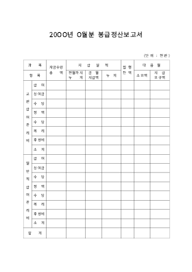 봉급정산보고서 ○OO년 O월분 봉급정산보고서 (단위 : 천원) 과 목 자금수령 총 액 지 급 실 적 집 행 잔 액 다 음 월 항 목 전월까지 누 계 금 월 지급액 누 계 소요액 지 급 요구액 교 원 급 여 관 리 비 급 여 상여금 수 당 정 액 수 당 복 리 후생비 소 계 일 반 직 급 여 관 리 비 급 여 상여금 수 당 정 액 수 당 복 리 후생비 소 계 합 계