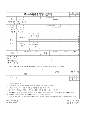○ ○ 민 공 ○;사유림내채석허가신청서 처리기간 ○ 일 신청인 성 명 주민등록번호 ~ 주 소 (전화번호) 당해산림에 대한 신청인의 권리관계 산 림 소유자 성 명 주민등록번호 ~ 주 소 (전화번호) 산 림 소 재 지 벌 채 구 역 면 적 ㎡ 허 가 면 적 채석면적 채 취 장 ㎡ 산 물 처 리 장 ㎡ 기 타 ㎡ 계 ㎡ 부대시설 면적 진 입 로 ㎡ 관리사무실부지 ㎡ 계 ㎡ 합 계 ㎡ 종류와 수량 석재의종류 수량 입목 재적 수종별 본수 재적 ㎥ ㎥ 석 재 의 용 도 벌 채 기 간 . . . ~ . . . 채석및반출기간 . . . ~ . . . 채 석 방 법 산림법 제○조제○항의 규정에 의하여 위와 같이 공 ○;사유림내 채석허가를 신청합니다. 년 월 일 신청인 (서명 또는 인) 귀하 구 비 서 류 수 수 료 없 음 ○. 채석구역실측도 ○부 ○. 채석수량에 대한 구적도 ○부(채석타당성 평가를 받지 아니하는 경우) ○. 산림의 소유권 또는 사용 ○;수익권을 증명할 수 있는 서류 ○부 ○. ○인이