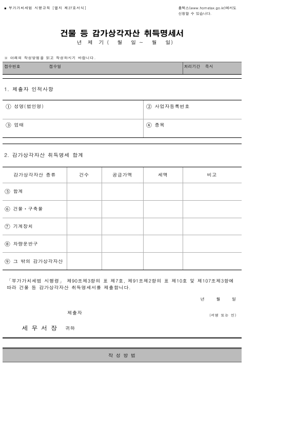 제정이유시작 ■ 부가가치세법 시행규칙 [별지 제○호서식] 홈텍스(www.hometax.go.kr)에서도 신청할 수 있습니다. 건물 등 감가상각자산 취득명세서 년 제 기 ( 월 일 ~ 월 일) ※ 아래의 작성방법을 읽고 작성하시기 바랍니다. 접수번호 접수일 처리기간 즉시 ○. 제출자 인적사항 ① 성명(법인명) ② 사업자등록번호 ③ 업태 ④ 종목 ○. 감가상각자산 취득명세 합계 감가상각자산 종류 건수 공급가액 세액 비고 ⑤ 합계 ⑥ 건물ㆍ구축물 ⑦ 기계장치 ⑧ 차량운반구 ⑨ 그 밖의 감가상각자산 「부가가치세법 시행령」 제○조제○항의 표 제○호, 제○조제○항의 표 제○호 및 제○조제○항에 따라 건물 등 감가상각자산 취득명세서를 제출합니다. 년 월 일 제출자 (서명 또는 인) 세 무 서 장 귀하 작 성 방 법 ① ~ ④: 제출자의 성명 또는 법인명과 사업자등록번호, 업태, 종목을 적습니다. ⑤: 신고대상기간 중 취득한 건물ㆍ구축물ㆍ기계장비ㆍ차량운반구 등 감가상각자산의 건수ㆍ공급가액ㆍ세액을