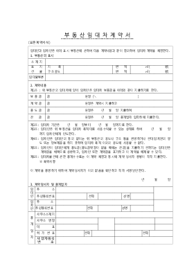 부 동 산 임 대 차 계 약 서 임대인과 임차인은 아래 표시 부동산에 관하여 다음 계약내용과 같이 합의하여 임대차 계약을 체결한다. ○. 부동산의 표시 소 재 지 토 지 건 물 지 목 구조 ○;용도 면 적 면 적 ㎡( 평) ㎡( 평) 임대할부분 ○. 계약내용 제○조 : 위 부동산의 임대차에 있어 임차인은 임대차 보증금을 아래와 같이 지불하기로 한다. 보 증 금 금 원정 (₩ ) 계 약 금 금 원정은 계약시 지불하고 중 도 금 금 원정은 년 월 일 지불하며 잔 금 금 원정은 년 월 일 중개업자 입회하에 지불한다. 제○조: 임대차 기간은 년 월 일부터 년 월 일까지로 한다. 제○조: 임대인은 위 부동산을 임대차 목적대로 사용 ○;수익할 수 있는 상태로 하여 년 월 일 까지 임차인에게 인도한다. 제○조: 임차인은 임대인의 동의 없이는 위 부동산의 용도나 구조 등을 변경하거나 전대 ○;임차권의 양 도 또는 담보제공을 하