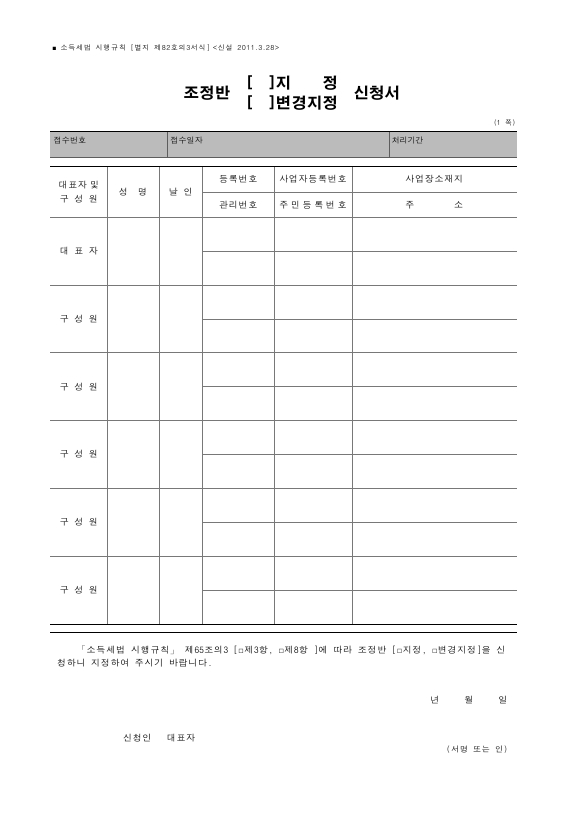 ■ 소득세법 시행규칙 [별지 제○호의○서식] <신설 ○.○.○> 조정반 [ ]지 정 [ ]변경지정 신청서 (○ 쪽) 접수번호 접수일자 처리기간 대표자및 구 성 원 성 명 날 인 등록번호 사업자등록번호 사업장소재지 관리번호 주민등록번호 주 소 대 표 자 구 성 원 구 성 원 구 성 원 구 성 원 구 성 원 「소득세법 시행규칙」 제○조의○ [□제○항, □제○항 ]에 따라 조정반 [□지정, □변경지정]을 신청하니 지정하여 주시기 바랍니다. 년 월 일 신청인 대표자 (서명 또는 인) 지 방 국 세 청 장 귀하 ○㎜×○㎜(일반용지 ○g/㎡(재활용품)) (○ 쪽) 조정반지정변경내용 및 사유 내용 변경전 변경후 사 유 ㈜ ○. 조정반변경신청시에는 당초 지정서를 첨부 ○. 변경후 내용을 앞면에 기재 ○. 조정반지정신청시에는 뒷면 기재 생략 ○㎜×○㎜(일반용지 ○g/㎡(재활용품))