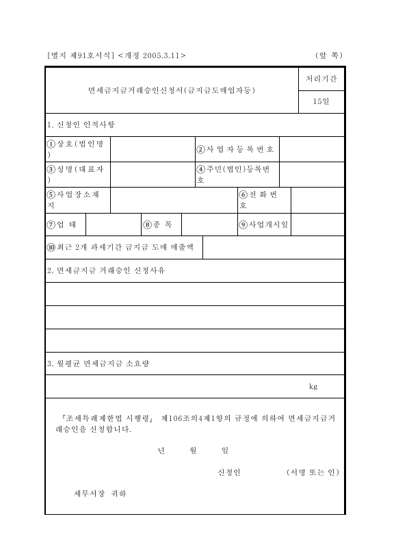 별지 제○호서식 [별지 제○호서식] <개정 ○.○.○> (앞쪽) 면세금지금거래승인신청서(금지금도매업자등) 처리기간 ○일 ○. 신청인 인적사항 ①상호(법인명) ②사업자등록번호 ③성명(대표자) ④주민(법인)등록번호 ⑤사업장소재지 ⑥전화번호 ⑦업태 ⑧종목 ⑨사업개시일 ⑩최근 ○개 과세기간 금지금 도매 매출액 ○. 면세금지금 거래승인 신청사유 ○. 월평균 면세금지금 소요량 kg 「조세특례제한법 시행령」 제○조의○제○항의 규정에 의하여 면세금지금거래승인을 신청합니다. 년 월 일 신청인 (서명 또는 인) 세무서장 귀하 구비서류 : 법인인 경우 임원명부 ○부 수수료 없음 ○mm×○mm(신문용지 ○g/㎡(재활용품)) 이 신청서는 아래와 같이 처리됩니다. (뒤쪽) 신청인 처리기관 관할세무서 면세금지금 거래(수입)추천자 신청서작성및제출 ▶ 민원실(접수) ▼ 승인심사 (세원관리과장) ▼ 승인서발급 (세원관리과장)