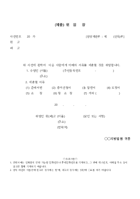 사 건 명 (제출) 위 임 장 사건번호 ○ 가 [담당재판부 : 제 (단독)부] 원 고 피 고 위 사건에 관하여 다음 사람에게 아래의 서류를 제출할 것을 위임합니다. ○. 수임인 (이름) (주민등록번호 ) (주소) ○. 제출할 서류 (○) 준비서면 (○) 증거신청서 (○) 답변서 (○) 보정서 (○) 소 장 (○) 항 소 장 (○) 기타 ( ) ○ . . . 위임인 원(피)고 (이름) (날인 또는 서명) (주소) (연락처) ○지방법원 귀중 ◇유의사항◇ ○. 연락처에는 언제든지 연락 가능한 전화번호나 휴대전화번호를 기재하고, 그 밖에 팩스번호, 이메일 주소 등이 있으면 함께 기재하기 바랍니다. ○. 양식 하단의 이름란에 원고의 경우에는 ‘원‘에, 피고의 경우에는 ’(피)‘에 ○표를 하기 바랍니다.