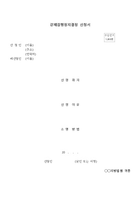 사 건 명 강제집행정지결정 신청서 수입인지 ○,○원 신 청 인 (이름) (주소) (연락처) 피신청인 (이름) 신 청 취 지 신 청 이 유 소 명 방 법 ○ . . . 신청인 (날인 또는 서명) ○지방법원 귀중
