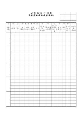 생산품목선택표 생 산 품 목 선 택 표 ① ② ③ ④ 변 동 적 비 용 ⑤ ⑥ ⑦ ⑧ ⑨ (○) (') 제품 그룹 품 명 단가 원 재료비 외주 가공비 간접 재료비 소 계 ③ ④ 개당 가공액 단 위 당 소요시간 ⑤÷⑥ 시간당 개당가공액 비 교 순 위 생산수 ⑥×⑨ 소 요 시 간 ⑤×⑨ 총 가공액