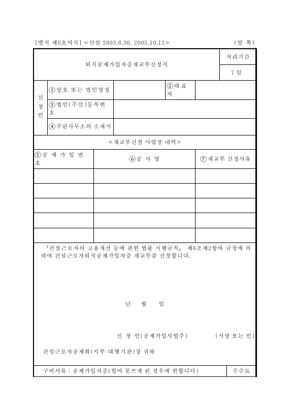 [별지 제○호서식] <신설 ○.○.○, ○.○.○> (앞쪽) 퇴직공제가입자증재교부신청서 처리기간 ○일 신청인 ①상호 또는 법인명칭 ②대표자 ③법인(주민)등록번호 ④주된사무소의 소재지 <재교부신청 사업장 내역> ⑤공제가입번호 ⑥공사명 ⑦재교부 신청사유 「건설근로자의 고용개선 등에 관한 법률 시행규칙」 제○조제○항의 규정에 의하여 건설근로자퇴직공제가입자증 재교부를 신청합니다. 년 월 일 신청인(공제가입사업주) (서명 또는 인) 건설근로자공제회(지부·대행기관)장 귀하 구비서류 : 공제가입자증(헐어 못쓰게 된 경우에 한합니다) 수수료 없 음 ○mm×○mm (일반용지 ○g/㎡(재활용품)) (뒤쪽) 이 신청서는 아래와 같이 처리됩니다. 신청인 처리기관 공제회지부·대행기관 신청 ▶ 접수 ▼ 확인·검토 ▼ 결재 ▼ 재교부 ◀ 전산입력