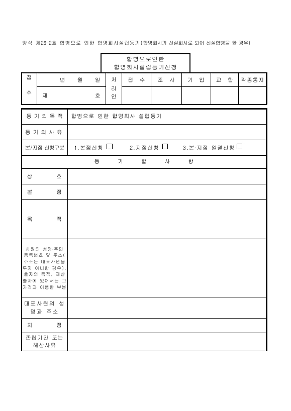 대법원 홈페이지 중 상업등기 양식 제○ ○호 합병으로 인한 합명회사설립등기(합명회사가 신설회사로 되어 신설합병을 한 경우) 합병으로인한 합명회사설립등기신청 접 수