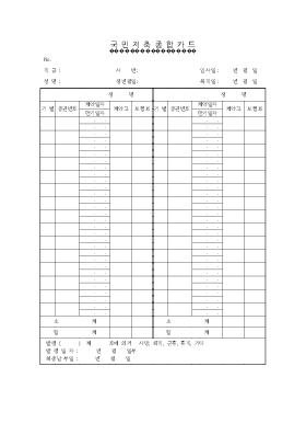 국 민 저 축 종 합 카 드 No. 직 급 : 사 번: 입사일 : 년 월 일 성 명 : 생년월일: 복직일 : 년 월 일 생 명 생 명 기 별 증권번호 계약일자 계약고 보험료 기 별 증권번호 계약일자 계약고 보험료 만기일자 만기일자 . . . . . . . . . . . . . . . . . . . . . . . . . . . . . .