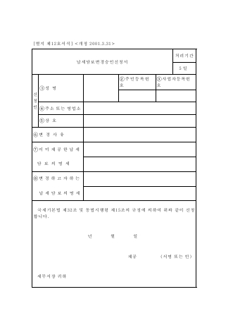 [별지 제○호서식] <개정 ○.○.○> 납세담보변경승인신청서 처리기간 ○일 신청인 ①성명 ②주민등록번호 ③사업자등록번호 ④주소 또는 영업소 ⑤상호 ⑥변경사유 ⑦이미제공한납세 담보의명세 ⑧변경하고자하는 납세담보의명세 국세기본법 제○조 및 동법시행령 제○조의 규정에 의하여 위와 같이 신청합니다. 년 월 일 제공 (서명 또는 인) 세무서장 귀하 구비서류 : 납세담보 제공에 필요한 서류 수수료 ※ 이 용지는 무료로 배부합니다. 없음 ○ ○민 ○㎜×○㎜ ○.○.○ 승인 (신문용지 ○g/㎥)