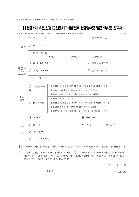 - 현금거래 시 영수증 미발급, 카드거절 등의 위법 행위를 국세청에 신고하기 위해 사용되는 문서입니다.