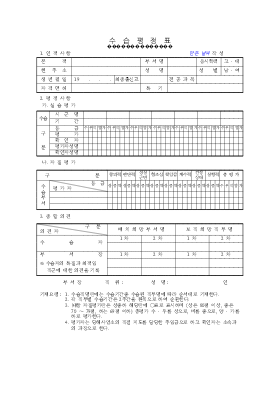 수습 평정표 문서는 한글(HWP) 형식으로 제공되어, 바로 다운로드하여 편리하게 사용할 수 있습니다. 필요한 서식을 빠르게 찾고 이용해보세요.