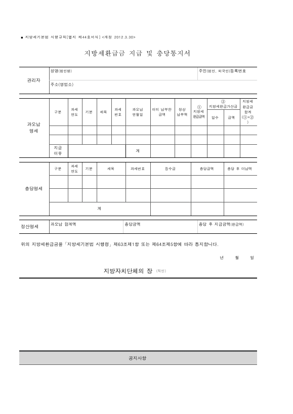 지방세환급금 지급 및 충당통지서, 지방세환급금 지급 요청서 [지방세기본법 시행규칙 서식44] 서식 무료 다운로드