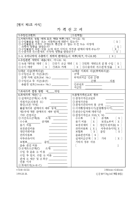 [별지 제○호 서식] [별지 제○호 서식] 가 격 신 고 서 ○.수입신고번호: ○.선적일: ○.거래가격의 성립 배제 요건 해당 여부(예:Y, 아니오: N) ①수입물품을 처분 또는 사용하는데 제한이 있는가? [ X ] ②수입물품의 가격이 금액으로 환산할 수 없는 조건 또는 사정에 의하여 영향을 받았는가? [ X ] ③수입물품의 처분 ○;사용 등에 따른 이익의 일부를 판매자에게 주는가? [ X ] ④수출자와 특수관계로 가격에 영향을 받았는가? [ X ] ○ ○. 우리나라에 수출하기 위하여 판매되는지 여부(예:Y, 아니오:N) [ X ] ○.수입관련 계약의 내용(예:Y, 아니오: N) ①독점 대리점 계약[ X ] ②장기 공급 계약[ X ]③일회 계약으로 분할 수입[ X ] ④수시 계약 [ X ] ⑤최초 거래 [ X ]⑥수출자와 특수관계 있음 [ X ] ○.대금 지급(무역지급) ①수입신고 전 지급(송금) 은행 거래 번호(Ref. No.) ②수입신고 후 지급(송금) 송품장 번호(Invoice
